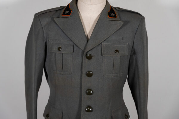 Ottima giacca M.40 fatta in cordellino, da Capitano di Artiglieria, completa di mostrine con appropriate stellette e gradi ridotti fatti in rayon sui polsi. Usata, buono stato di conservazione.