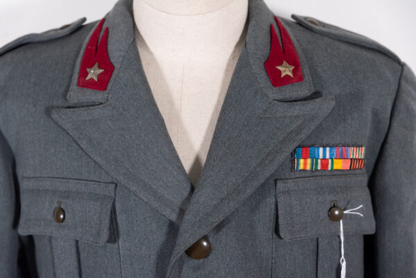 Ottima giacca M.40 da Maggiore dei Bersaglieri del Regio Esercito Italiano, fatta in panno doppia faccia, gabardina ritorta “Lanital”, completa dei suoi corretti attributi, gradi ridotti fatti in rayon, fiamme cremisi e ribbon da petto ridotti. Piccola etichetta “Unione Militare”. Poco usata, eccellente stato di conservazione.