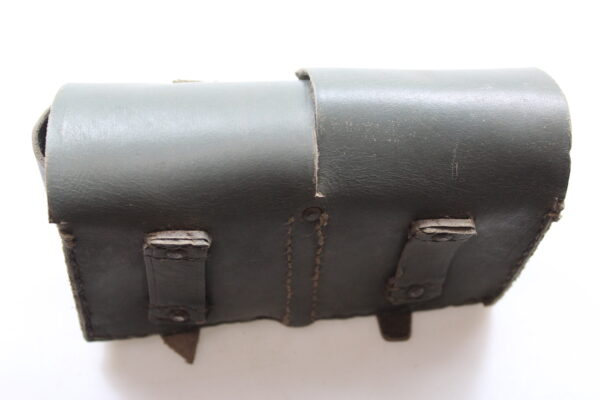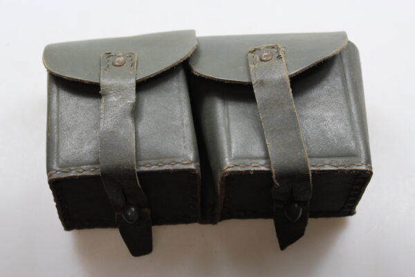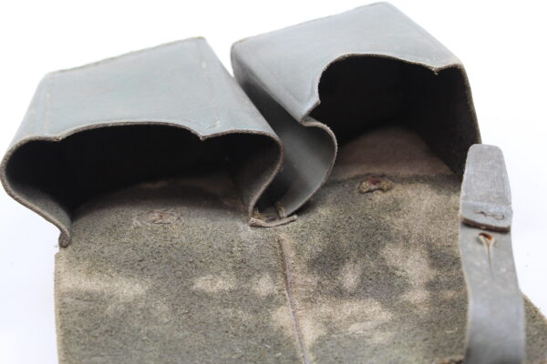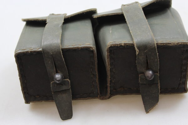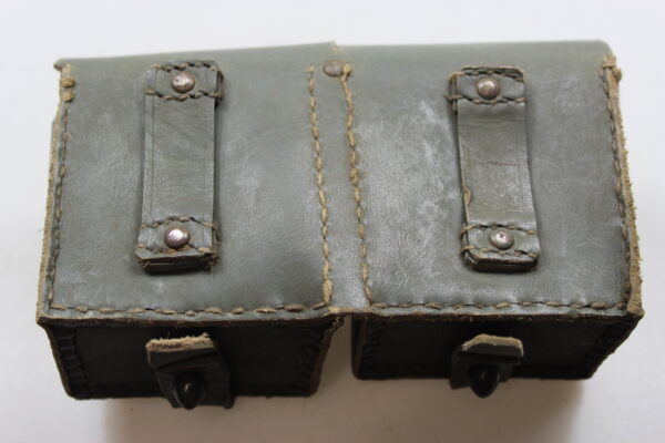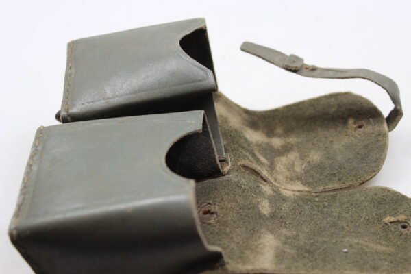 Giberna in cuoio grigio/verde per caricatori del Carcano 91, versione semplificata di fine guerra, senza il gancio per lo spallaccio. Poco usata, buono stato di conservazione.