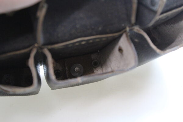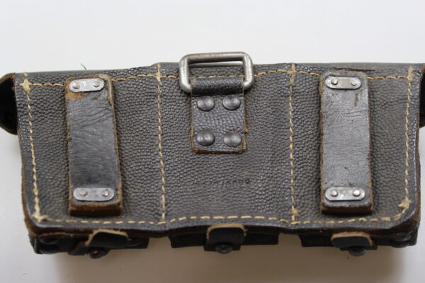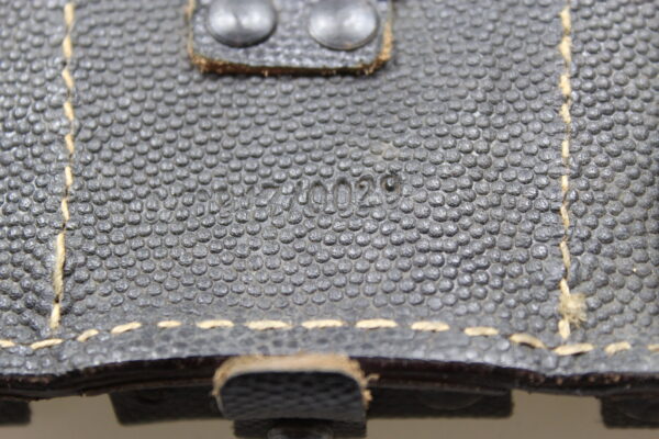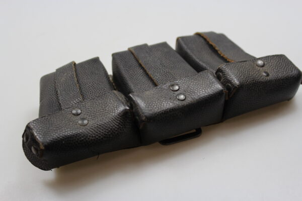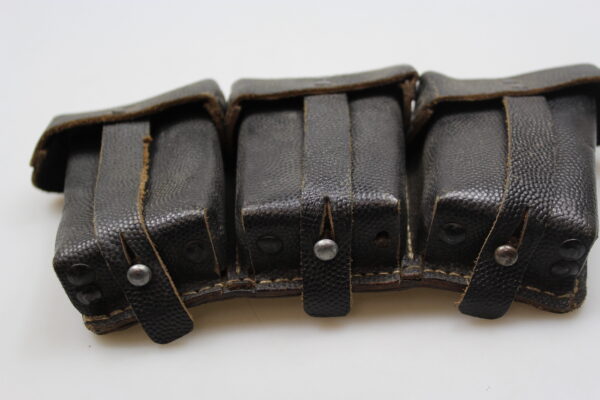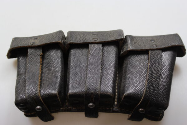 Giberna tripla per caricatori del K.98, fatta in cuoio nero, marcata con RBNr. Mancante dei separatori interni. Usata, buono stato di conservazione.