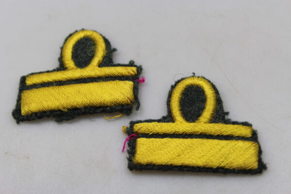 Coppia di gradi “ridotti”, periodo di guerra, fatti in rayon su base grigio/verde, per giacca M.40 da Maggiore del Regio Esercito Italiano. Presente etichetta “Unione Militare”. Usati, buono stato di conservazione.