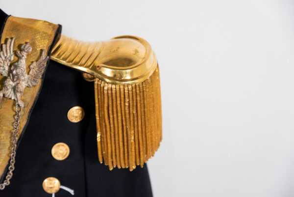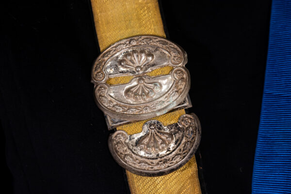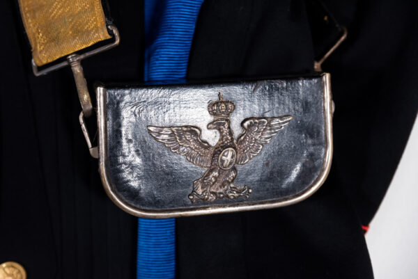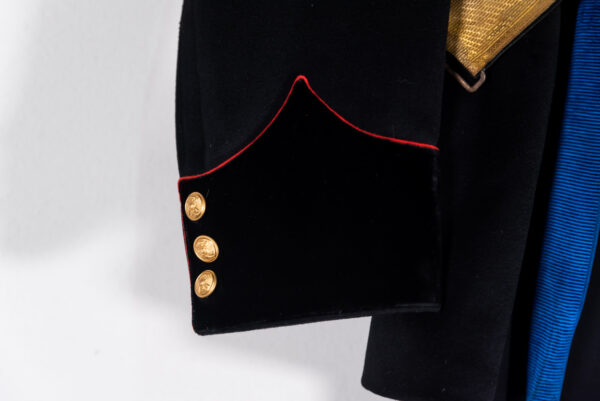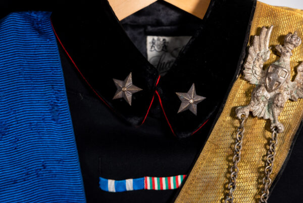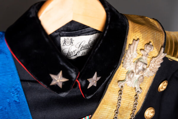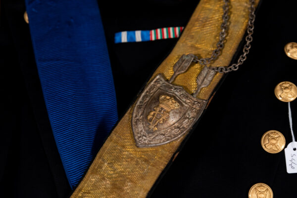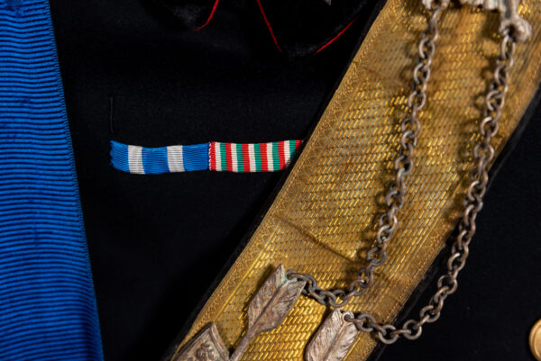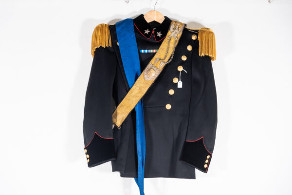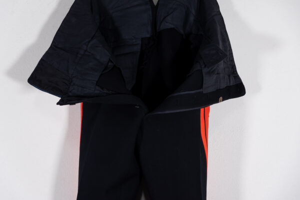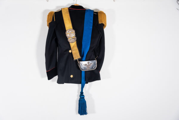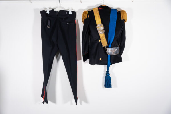 Giacca e pantaloni “Grande Uniforme” M.34 da Sottotenente di Fanteria del Regio Esercito Italiano. Giacca completa dei suoi corretti attributi con spalline a frangia, pantaloni dritti con banda rossa. Completa di bandoliera e fascia azzurra. Usata, buono stato di conservazione.