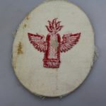 Specialità da manica per Artigliere della Kriegsmarine. Ricamato in filo di cotone rosso su fondo bianco di cotone, usato su uniforme bianca. Buono stato di conservazione.