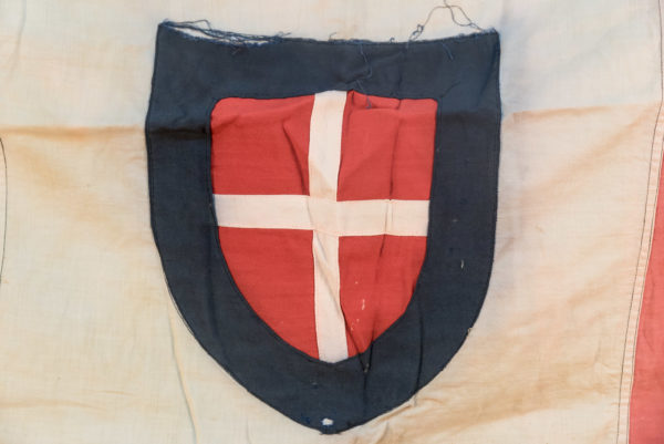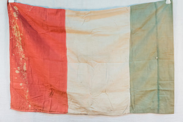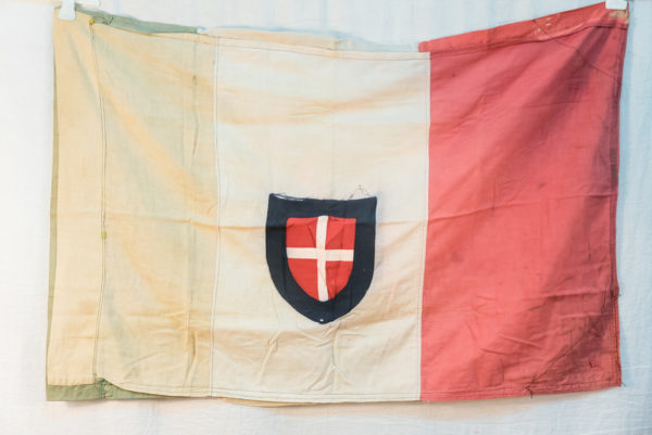 Bandiera tricolore con emblema Savoia, produzione “artigianale”,curiosa perche fatta a “sacco”. Dimensioni cm 115×80. Usata, leggermente sbiadita, bella patina.