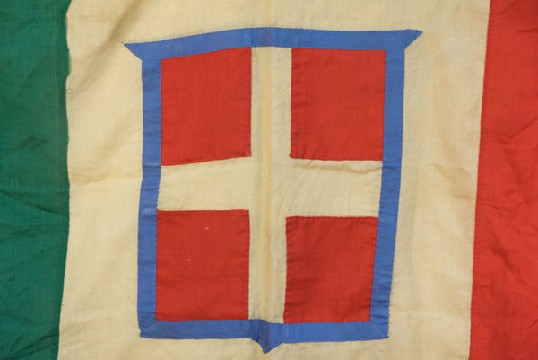 Bandiera tricolore con emblema Savoia al centro. Dimensioni cm 200×140. Usata in buono stato di conservazione, leggermente rovinata, causa sventolamento.