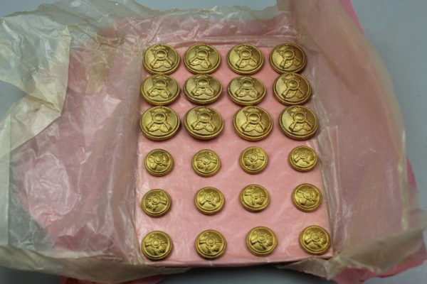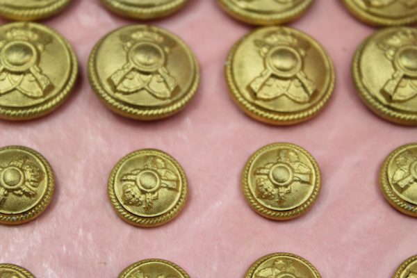 N°24 bottoni ( 12 di formato grande e 12 di formato piccolo ) per uniforme da Ufficiale di Fanteria del REI. Ancora montati su cartone, fondo di magazzino, mai usati.