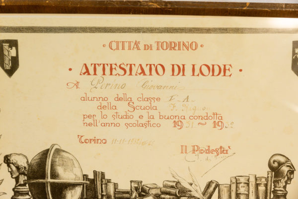 Attestato di lode rilasciato dal Podestà di Torino per l’anno scolastico 1931/32 ad un alunno meritevole. In cornice d’epoca, buono stato di conservazione.