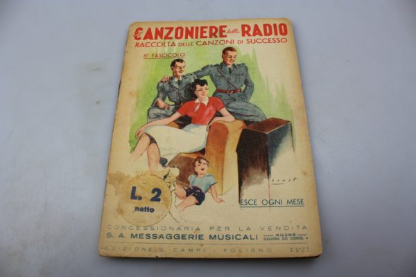 “Il canzoniere della radio” Libro tascabile con testi e musiche delle più conosciute canzoni Italiane del periodo bellico, bella la copertina con due soldati Italiani in uniforme grigio/verde. Buono stato di conservazione.