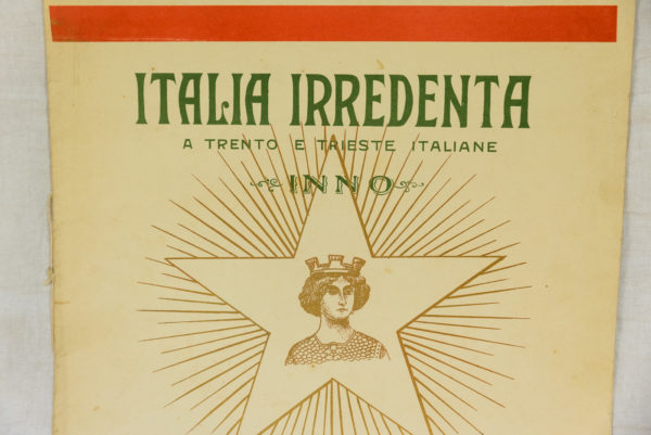 Spartito musicale con anche testo dell’inno “Italia irredenta” a Trento e Trieste Italiane. Usato in buono stato di conservazione.