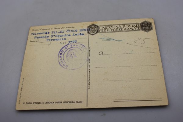 “Il Duca d’Aosta e l’eroica difesa dell’Amba Alagi” Cartolina postale dedicata al Duca Amedeo d’Aosta, compilata con mittente e timbro del Comando 5^ Squadra Aerea. Buono stato di conservazione.