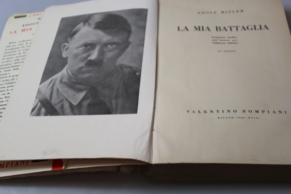 “La mia Battaglia” Adolf Hitler, versione in lingua Italiana del “Mein Kampf” edito da Bompiani, si tratta della 12^ edizione del 1940. Completo di sovracopertina. Usato, buono stato di conservazione.