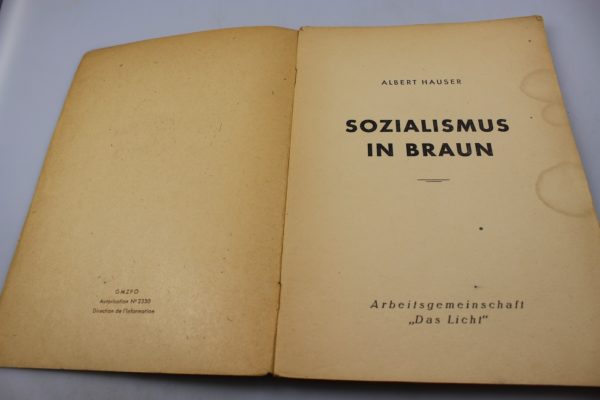 “Sozialismus in Braun” Albert Hauser – 1947. Libro satirico dell’immediato post guerra in cui si prendono in esame i grandi industriali Tedeschi, collusi con il regime Nazista. Buono stato di conservazione.