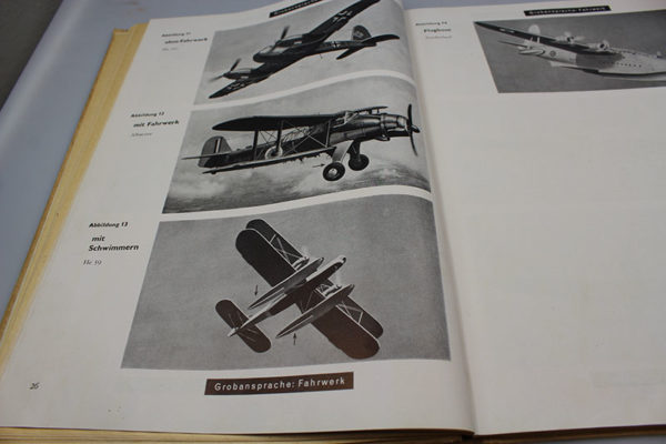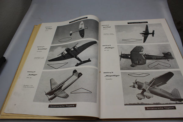 “Die Flugzeug Erkennung”,tradotto Il rilevamento dell’aeromobile. Libro tecnico illustrato in formato A4, uscito nel 1943, in cui la Luftwaffe in base ad uno studio, mostra foto e dati tecnici dei propri velivoli e di quelli delle altri eserciti, alleati e non, impegnati nella Seconda Guerra Mondiale. Usato, buono stato di conservazione.