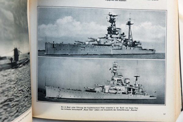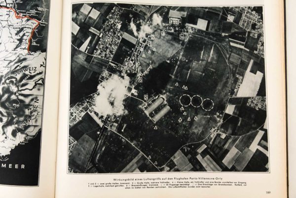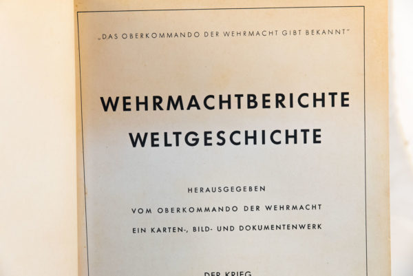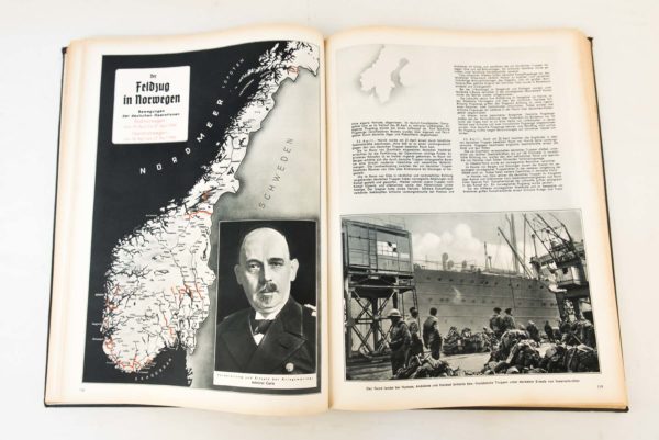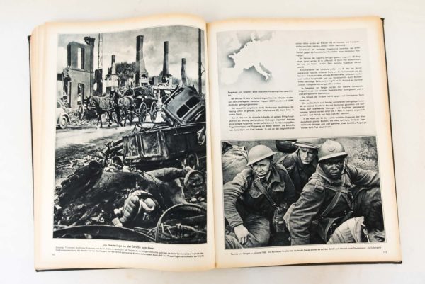 “WEHRMACHTBERICHTE WELTGESCHICHTE” Libro fotografico per l’annata 1939/40 ,a cura dell’Oberkommando der Wehrmacht. Elegante copertina, tolta in maniera chirurgica la svastica nel dopo guerra, dimensioni cm 37×27. Buono stato di conservazione.