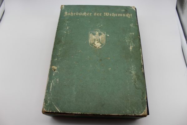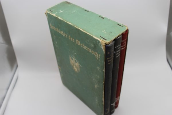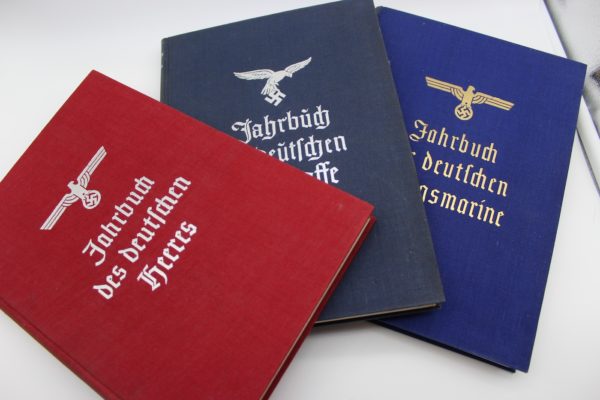 “Jahrbuch 1936”. Trittico dei tre volumi illustrati e fotografici del riepilogo dell’anno 1936 per Heer, Luftwaffe e Kriegsmarine, completi di specifico cofanetto. Poco usati, buono stato di conservazione.