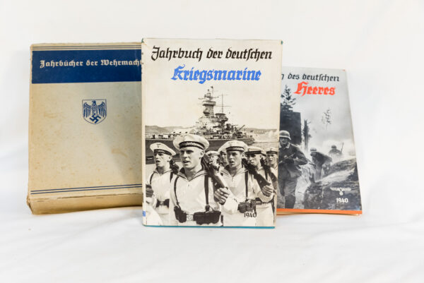 “Jahrbucher der Wehrmacht 1940” Serie di tre volumi molto fotografici, riepilogativi dell’anno 1940 per la Heer, la Kriegsmarine e la Luftwaffe, completi di sovra copertine e elegante cofanetto in cui sono alloggiati. Buono stato di conservazione.