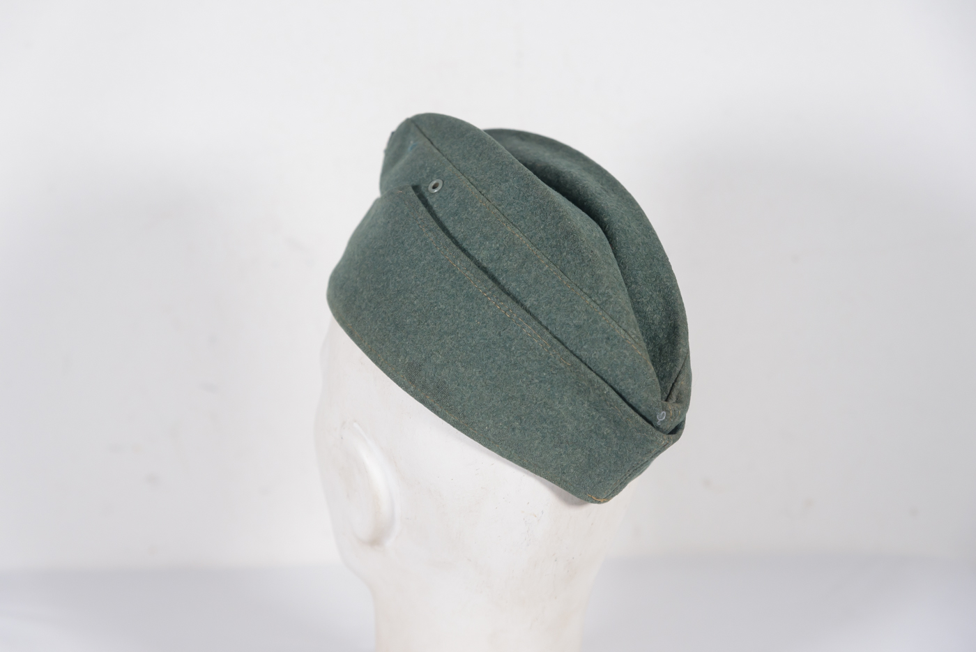 Bustina M.38 da truppa Artiglieria della Heer, completa di aquila e coccarda Be-Vo a “bassa visibilità” monteti a mano. Nessuna marcatura visibile nell’interno. Usata, buono stato di conservazione, bella patina.
