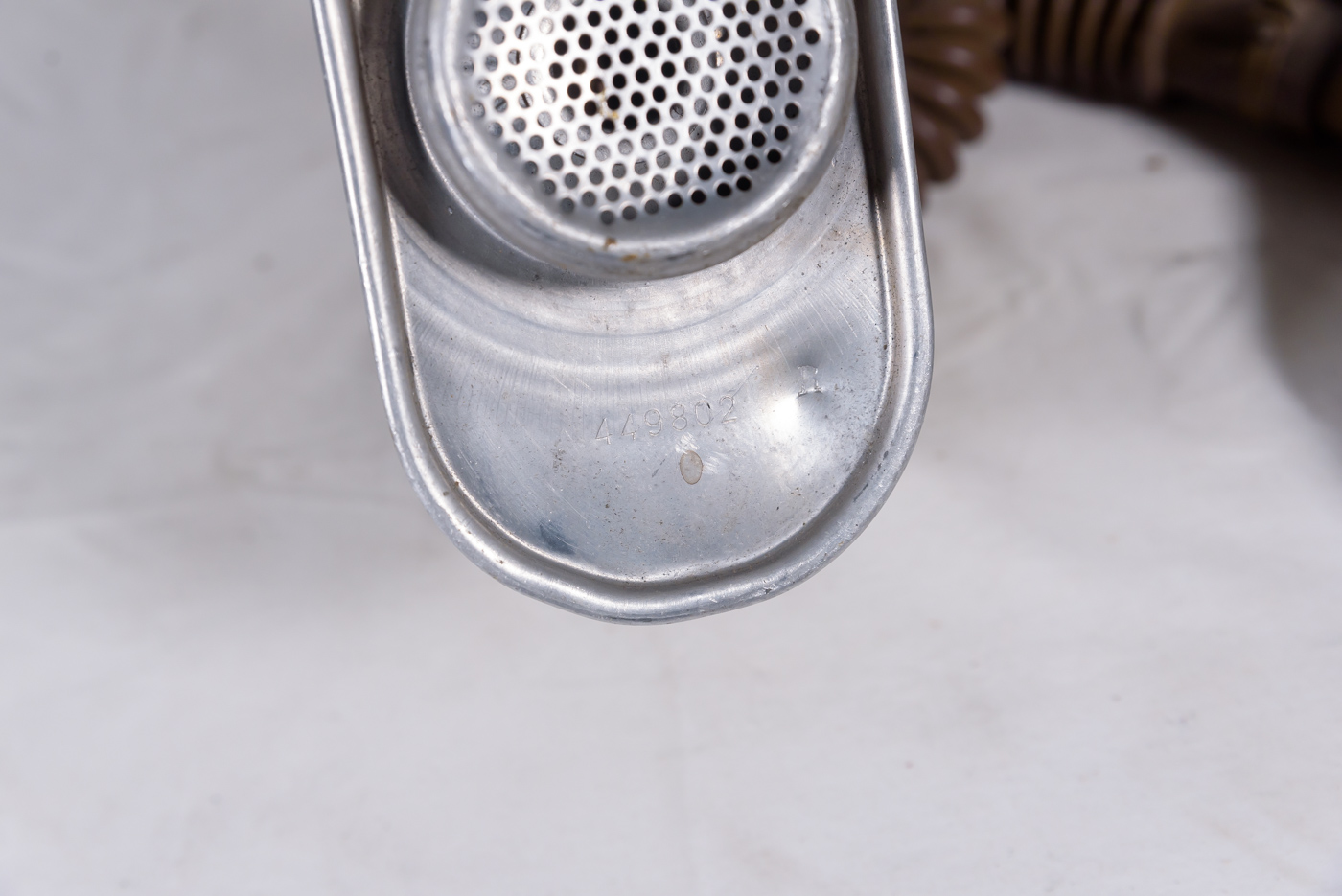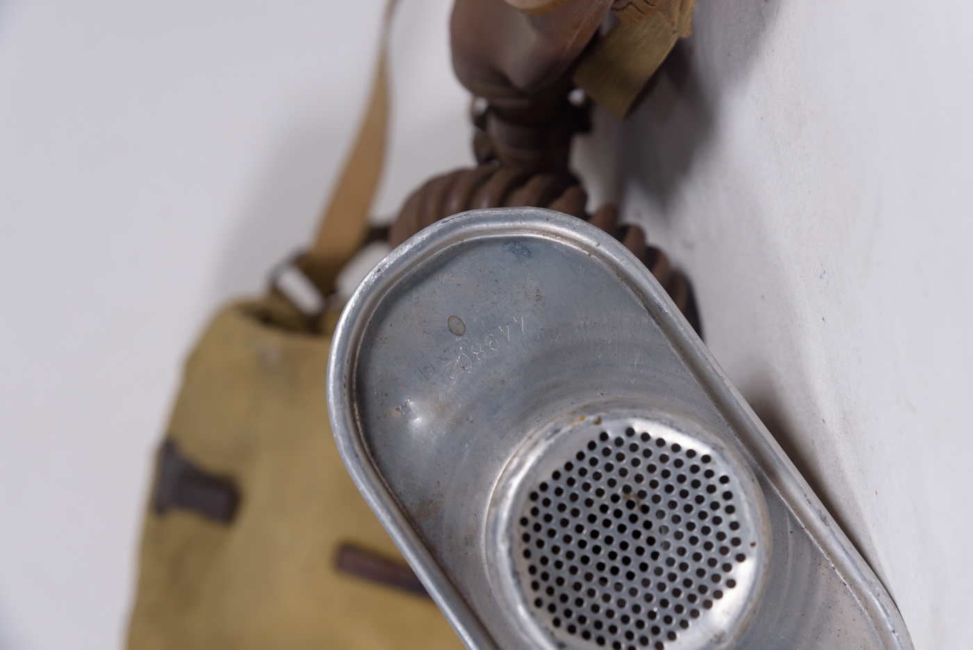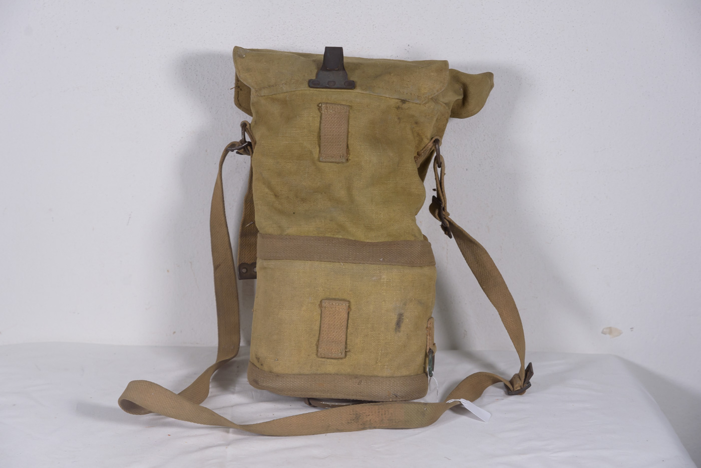 Maschera antigas Belga M.31 della Seconda Guerra Mondiale, prodotta dalla ditta italiana Sacic, completa di tubo corrugato, di filtro e di contenitore in canapa con tracolla. Usata, buono stato di conservazione.