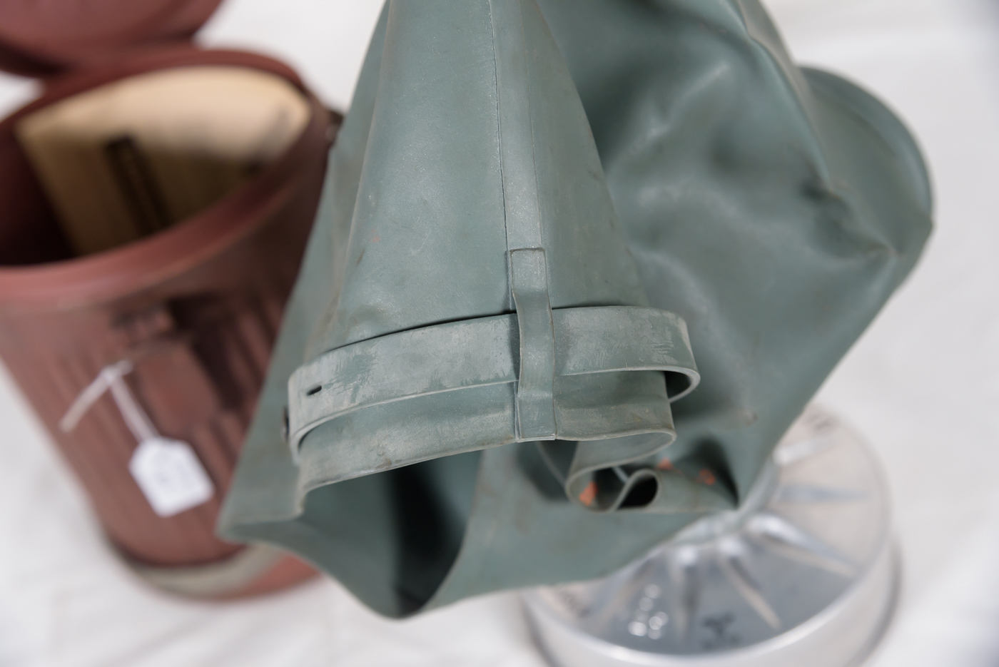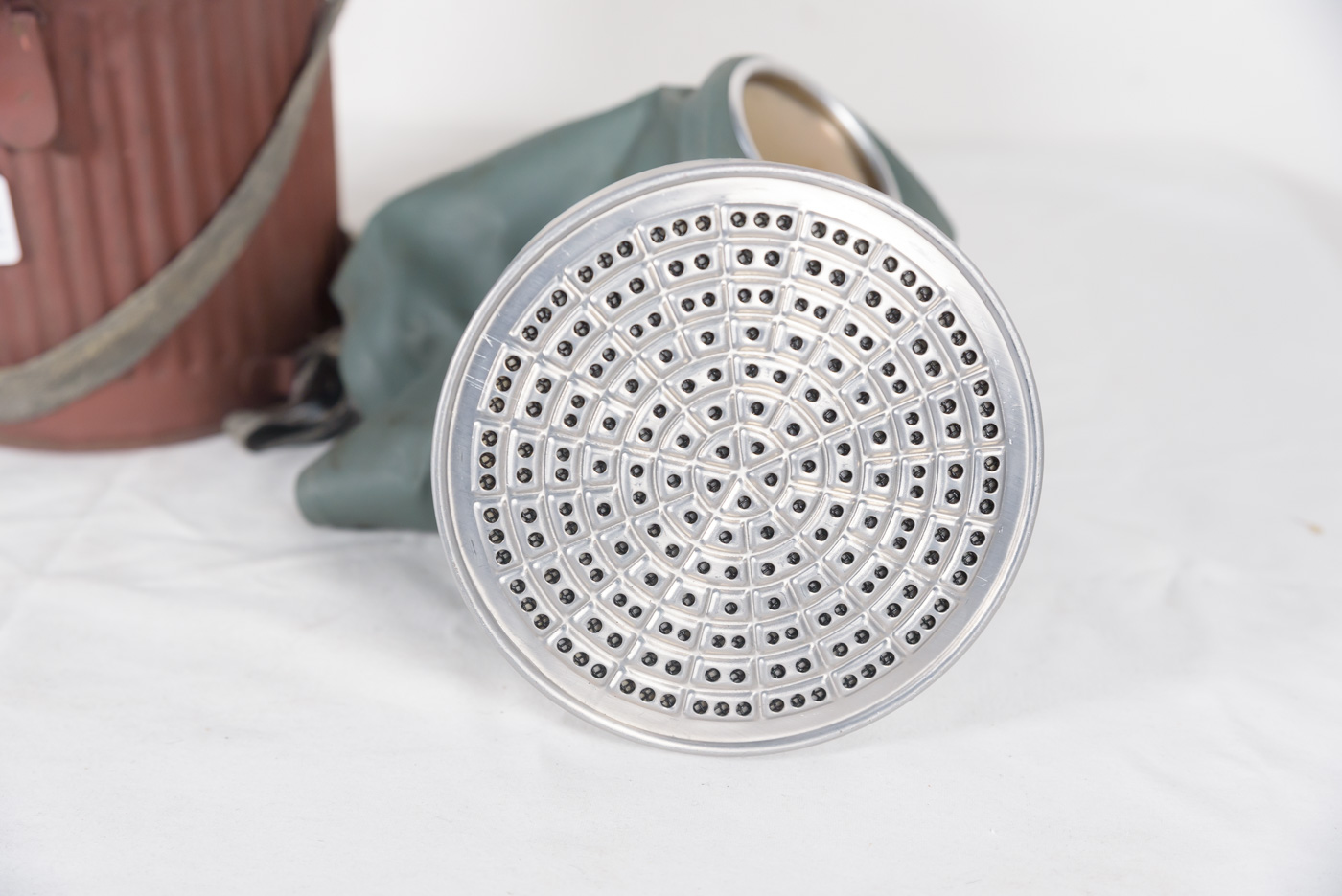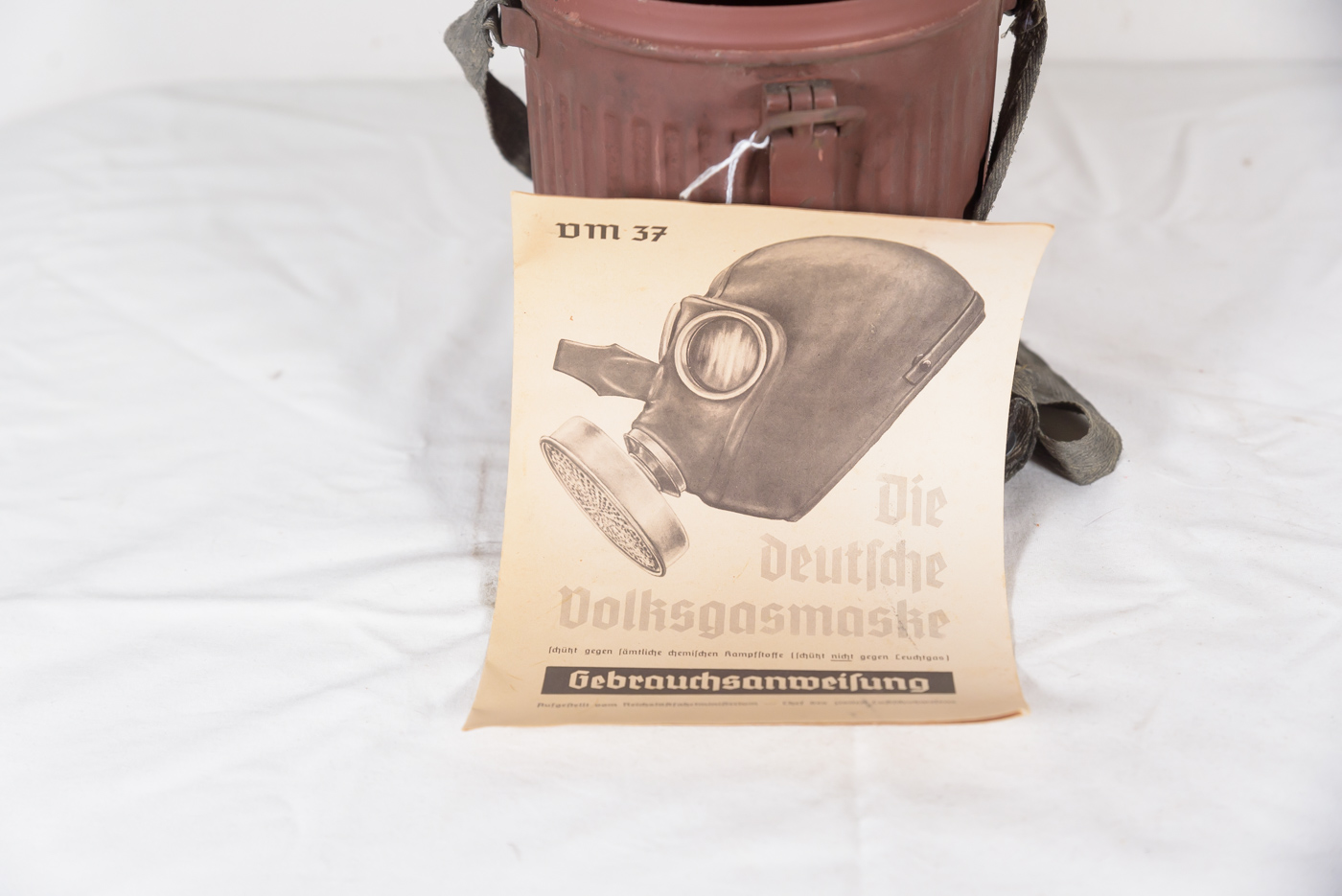 Maschera antigas WM – 37 in dotazione alla Luftschutz -Feuerwehr, completa di istruzioni e contenitore cilindrico in metallo completo di tracolla. Usata, buono stato di conservazione.