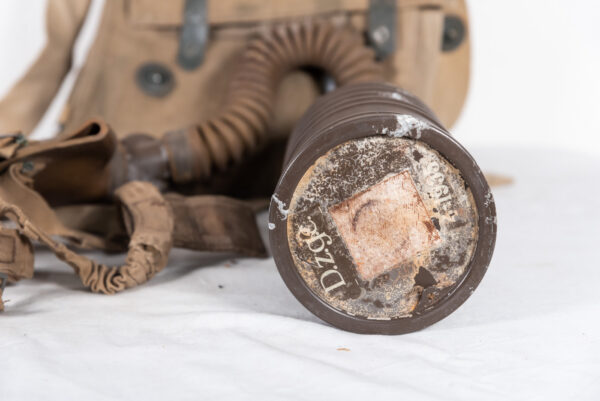 Maschera antigas M.33 del Regio Esercito Italiano della Seconda Guerra Mondiale, completa di tubo corrugato e specifico filtro, completa anche di sacca, marcata UNPA, con tracolla. Usata, buono stato di conservazione.