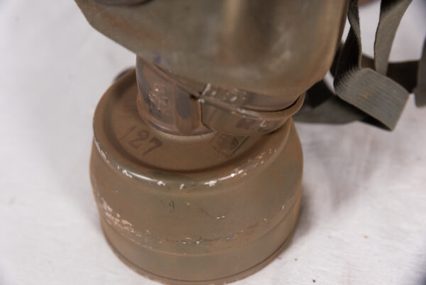 Maschera antigas con facciale in tela gommata, completa di filtro e contenitore in metallo, modello “basso” rispetto a quello successivo, mancante di cinghie per il trasporto, completo di lenti di ricambio. Usato, buono stato di conservazione.