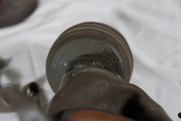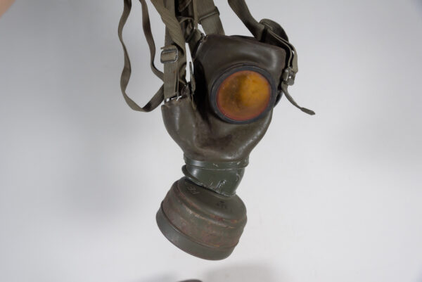 Maschera antigas M.38 della Wehrmacht nella Seconda Guerra Mondiale. Facciale in gomma, completo di filtro adeguato, cilindro alto completo di lenti di ricambio. Mancano le cinghie per il trasporto. Usata, buono stato di conservazione.