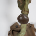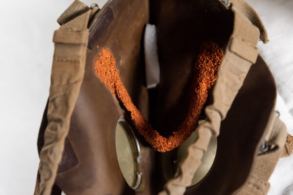 Maschera antigas Modello “Penna” anni 30′, completa di tubo corrugato e filtro specifico, sacca in tela con tracolla e lenti di ricambio “Penna”. Usata, buono stato di conservazione.