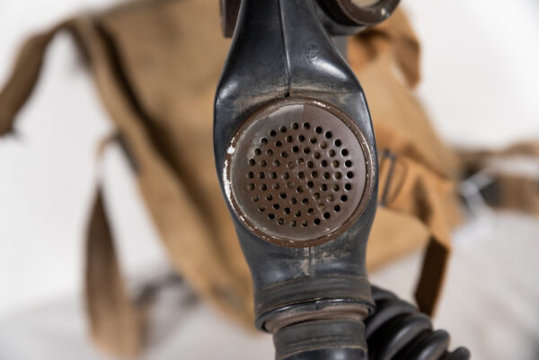 Maschera antigas O.41 Rs, detta “ottica” per i particolari oculari che facilitavano l’uso della stessa con strumentazione ottica. In dotazione a carristi e artiglieri, completa di tubo corrugato collegato al filtro classico T.35, completa di sacca con tracolla. Poco usata, buono stato di conservazione.