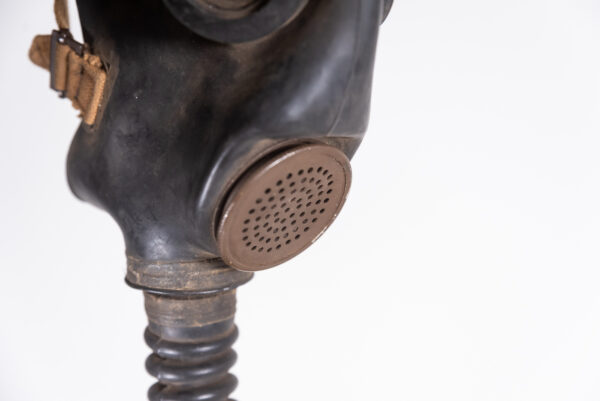 Maschera antigas O.41 Rs, detta “ottica” per i particolari oculari che facilitavano l’uso della stessa con strumentazione ottica. In dotazione a carristi e artiglieri, completa di tubo corrugato collegato al filtro classico T.35, completa di sacca con tracolla. Poco usata, buono stato di conservazione.