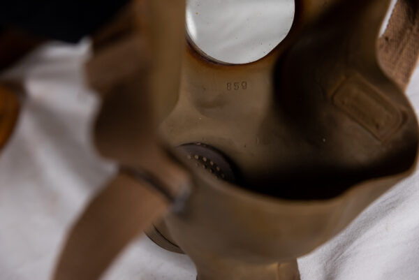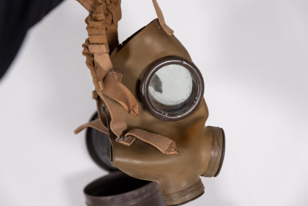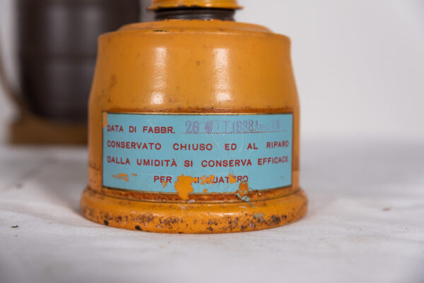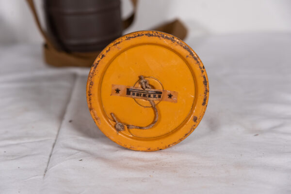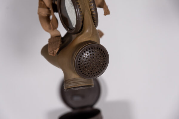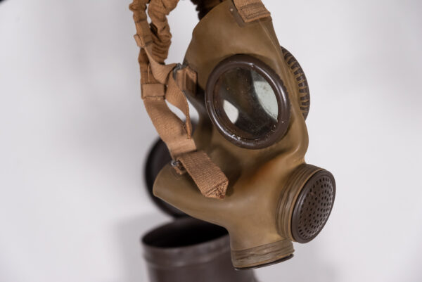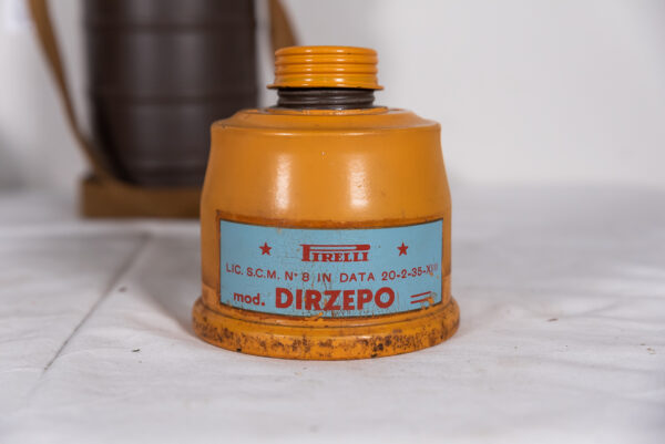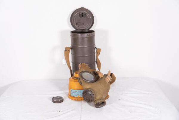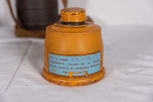 Interessante maschera antigas T.33 S.C.M., completa di specifico filtro e contenitore cilindrico completo di tracolla. Usata, buono stato di conservazione.