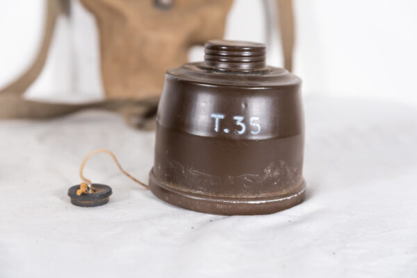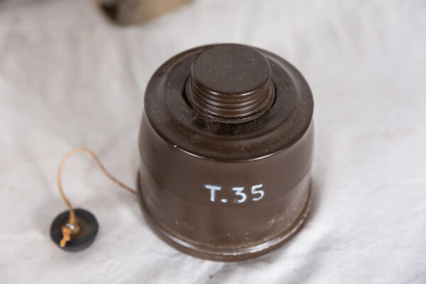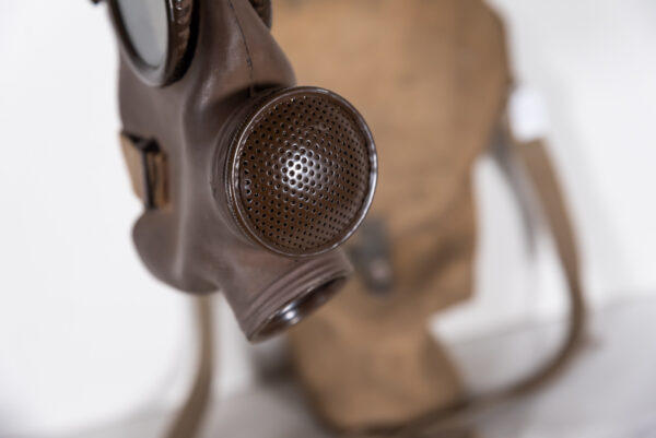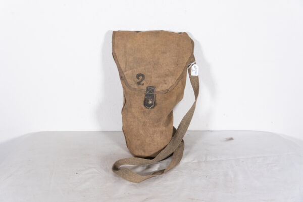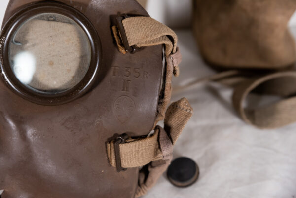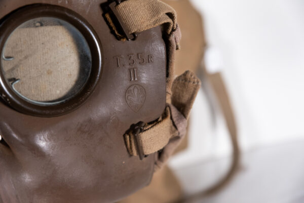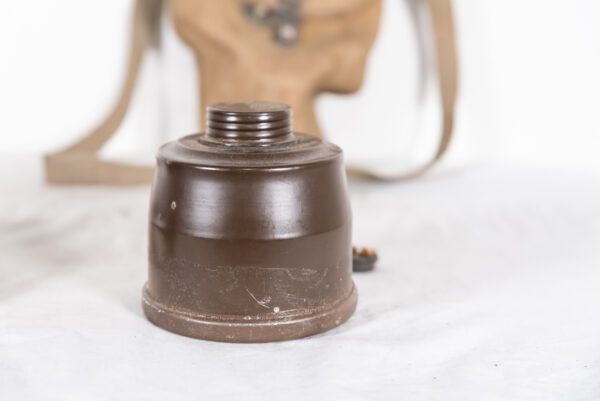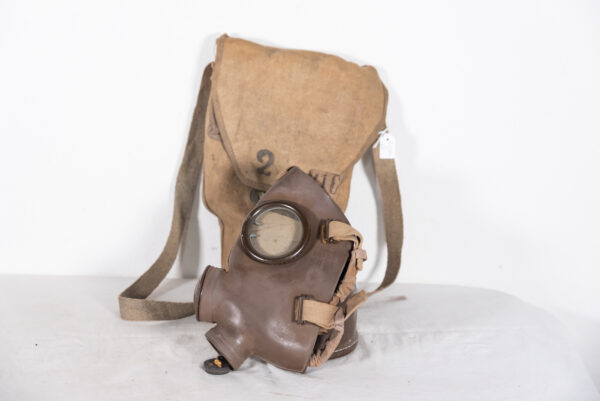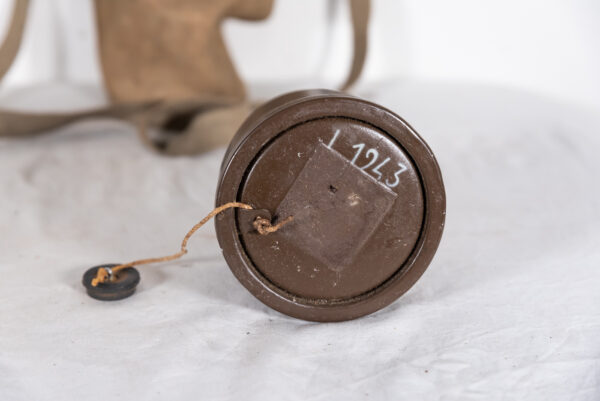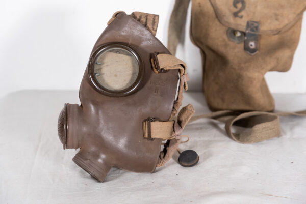 Maschera antigas T.35-R taglia II, in dotazione al Regio Esercito nella Seconda Guerra Mondiale, completa di filtro e specifica sacca con tracolla per il trasporto. Buono stato di conservazione.