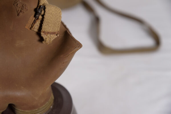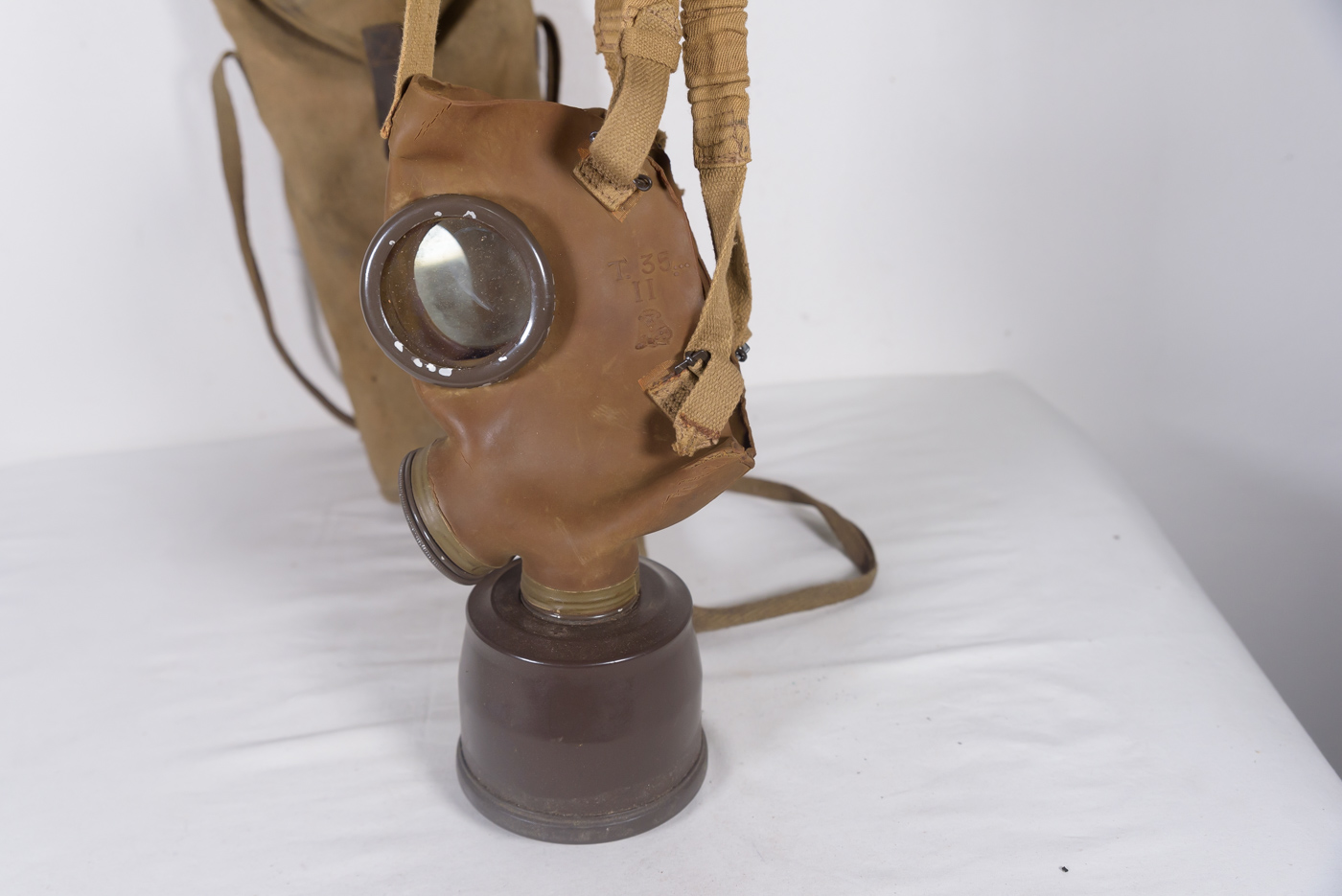 Maschera antigas T.35 taglia II, in dotazione al Regio Esercito nella Seconda Guerra Mondiale, completa di filtro e specifica sacca con tracolla per il trasporto. Stato di conservazione mediocre, facciale in gomma con qualche screpolatura.