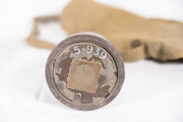 Maschera antigas T.35 taglia I, in dotazione al Regio Esercito nella Seconda Guerra Mondiale, completa di filtro e specifica sacca con tracolla per il trasporto. Buono stato di conservazione.