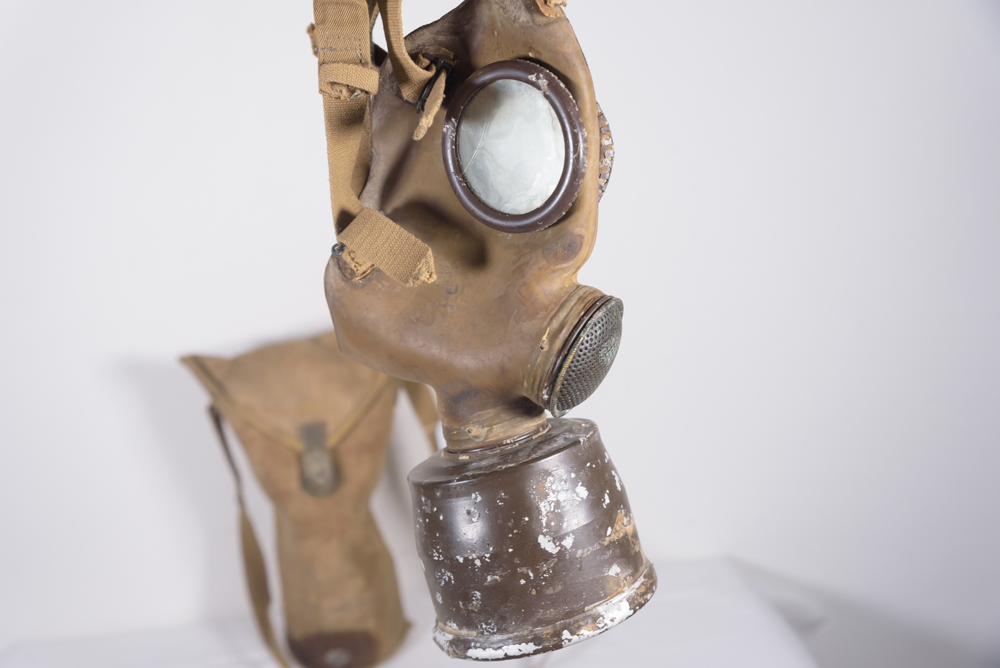 Maschera antigas T.35, taglia II, del Regio Esercito Italiano della Seconda Guerra Mondiale, completa di sacca con tracolla. Usata, stato di conservazione, mediocre nell’insieme.