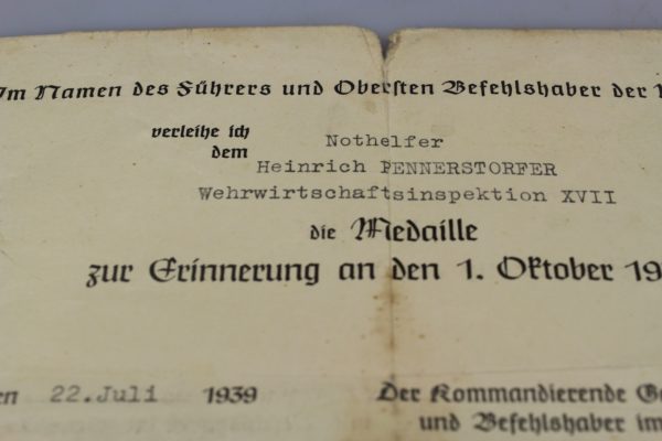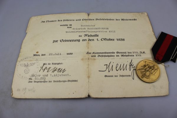 Medaglia 1° Ottobre 1938,Annessione dei Sudeti al III° Reich, completa di ribbon e attestato di conferimento. Buono stato di conservazione.