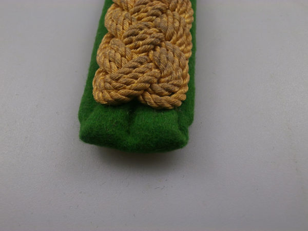 Spallina singola, in questo caso sulla giacca SA era previsto l’uso della singola spallina, valida da Sturmbannfuhrer a Standartenfuhrer delle SA, Sturm Abteilung, per unità di fanteria inclusa la Divisione Feldherrnhalle. Usata in buono stato di conservazione, completa di etichetta RZM.