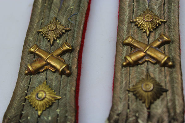 Coppia di spalline da Capitano di Artiglieria della Heer, complete di specialità metalliche, versione fissa da cucire nel giro manica. Usate, buono stato di conservazione, bella patina.