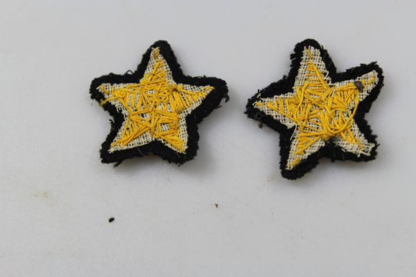 Coppia di stelle, ricamate in filo metallico dorato, su base di tessuto blù, per giacche da “imbarcato” da Ufficiale della Kriegsmarine, nella dimensione corretta. Usate, tolte da giacca, buono stato di conservazione.