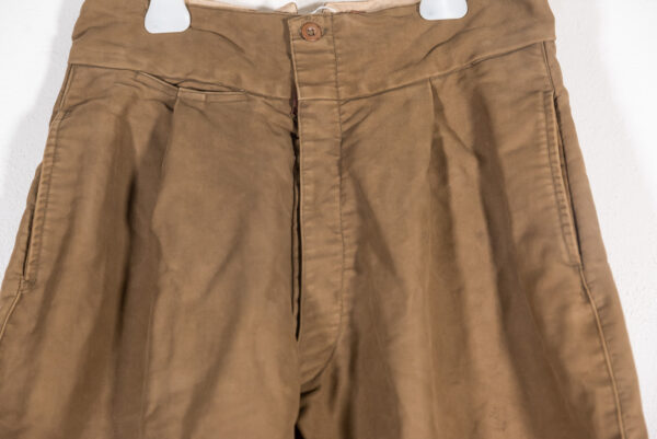 Pantaloni Coloniali da Ufficiale del Regio Esercito Italiano, fatti in tessuto di cotone “Olona” in colorazione giallo sabbia, bottoni in bakelite. Usati, buono stato di conservazione.