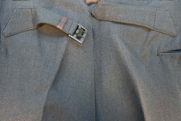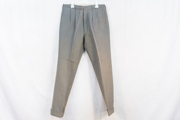 Pantaloni dritti, fatti in gabardina per Ufficiale del REI, completi di etichetta “Unione Militare” interna. Usati, buono stato di conservazione, presenti qualche piccolo buco di tarma all’altezza della patta, vedi foto in dettaglio.