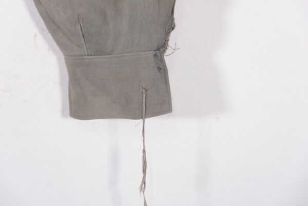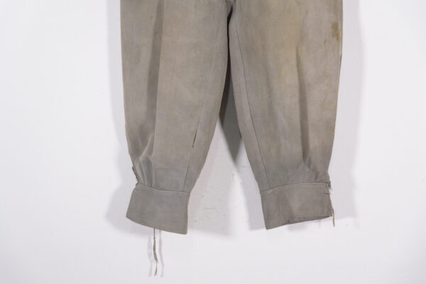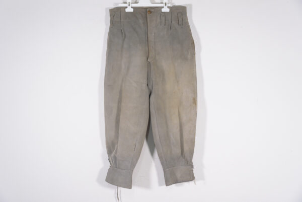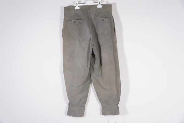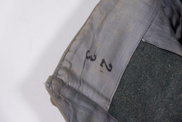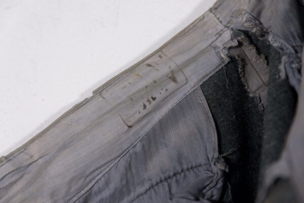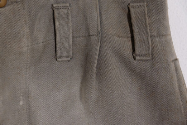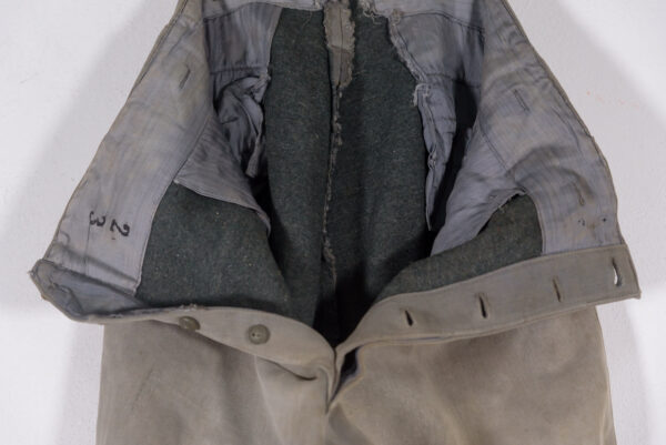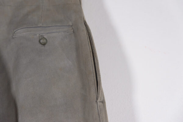 Pantaloni M.40 da truppa del Regio Esercito, fatti in gabardina pesante ritorta “Lanital”, con fodera in rayon spigato, marcati con taglia e stoccaggio. Usati, buono stato di conservazione.