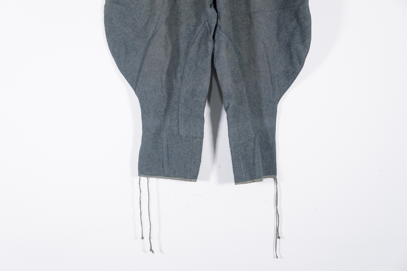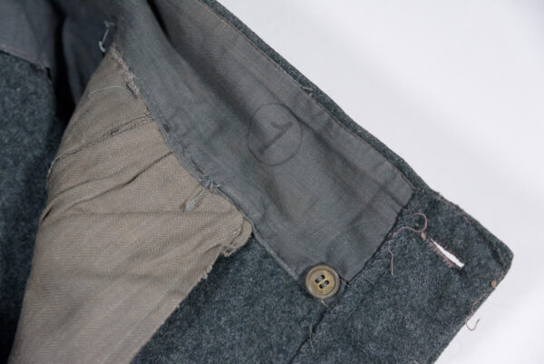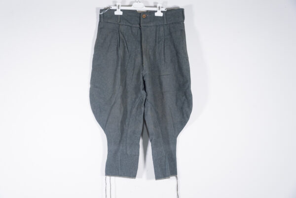 Pantaloni M.40 di intendenza, fatti in panno grigio/verde per Ufficiale del Regio Esercito Italiano, fodera grigia in cotone spigato, marcati con stoccaggio e taglia. Poco usati, buono stato di conservazione.