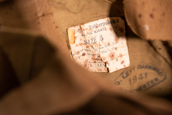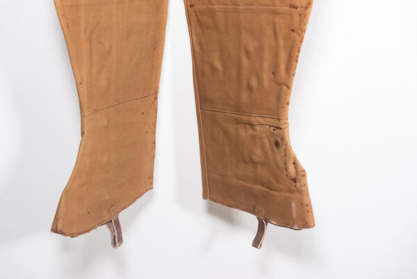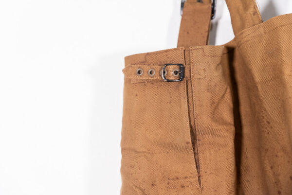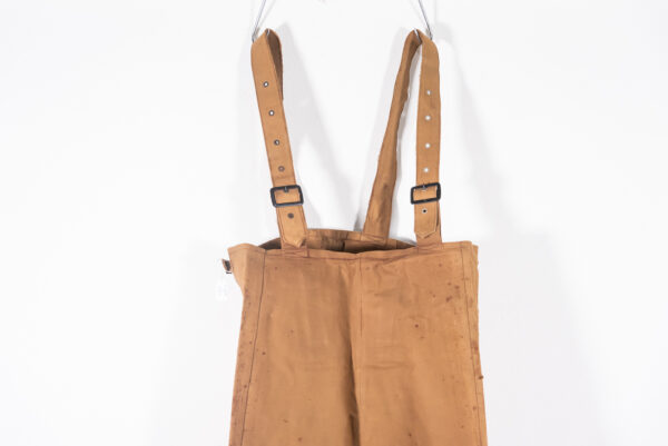 Pantaloni/salopette specifici per motociclista Inglese della Seconda Guerra Mondiale, versione fatta in tela gommata con ghette fisse. Marcati con WD e broad-arrow, produttore ed etichetta . Mai stati usati, buono lo stato di conservazione