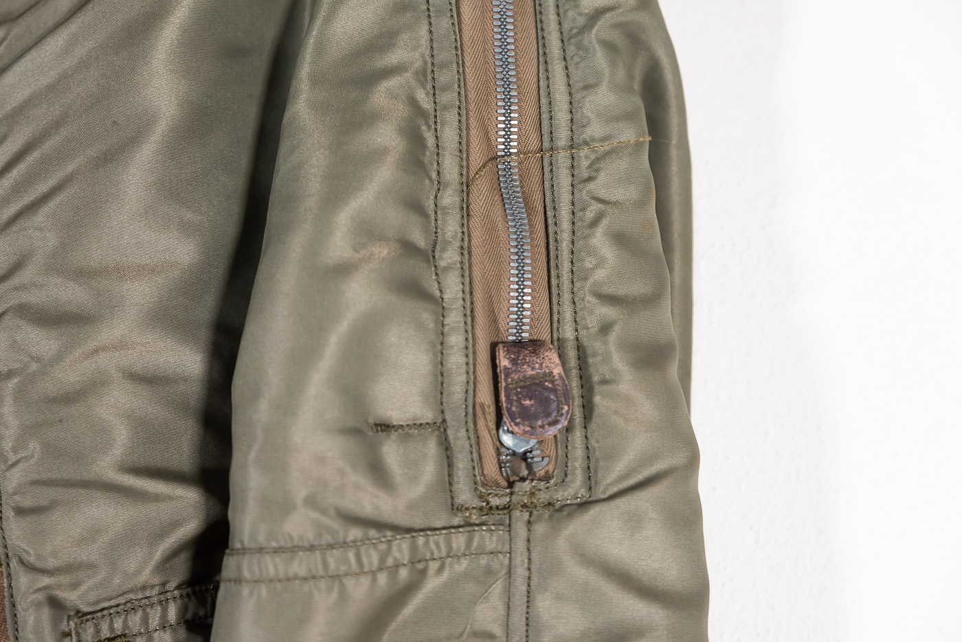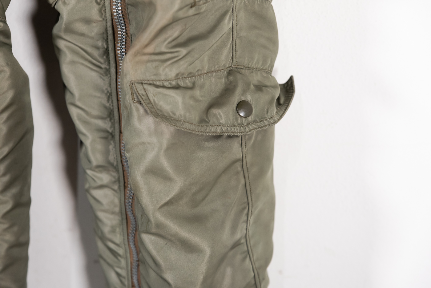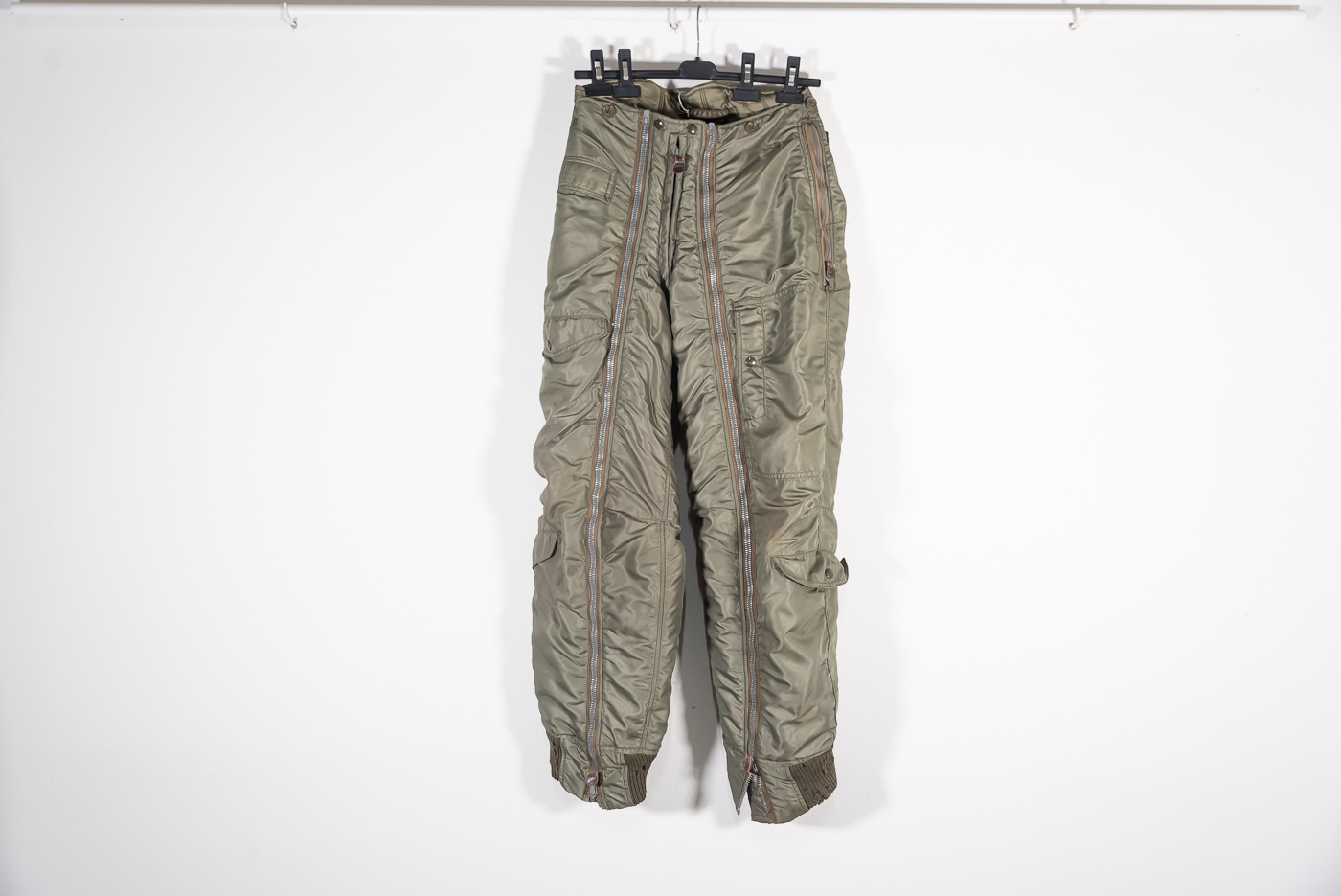 Pantaloni da volo USAAF A-11 B della Seconda Guerra Mondiale, cerniere e automatici OK, etichetta interna. Usati, complessivamente in buono stato di conservazione, qualche buchetto sui bordi in lana alle caviglie.