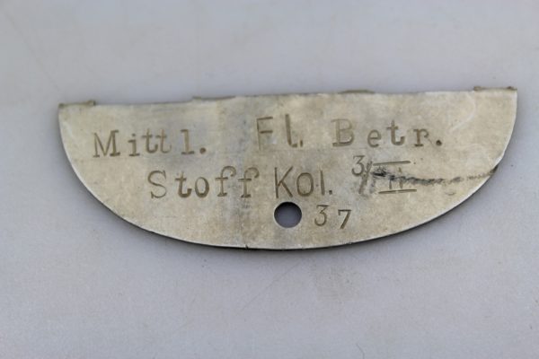 Mittl.Fl.Betr.Stoff.Kol.3/II – Mittlerer Flieger Betriebs Soff Kolonne, rifornimento carburante della Luftwaffe. Metà piastrino di riconoscimento fatto in alluminio. Buono stato di conservazione.