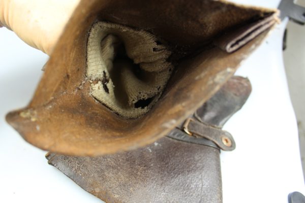Paio di guanti in fatti in pelle, probabilmente da motociclista, versione a tre dita, chiusura con automatici Prym. Usati in buono stato di conservazione.