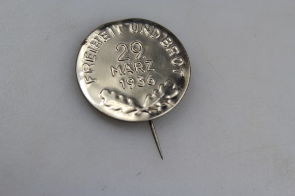 Pin “Freiheit und Brot”- 29 Marzo 1936, pin fatto in occasione delle elezioni parlamentari in Germania. Buono stato di conservazione.