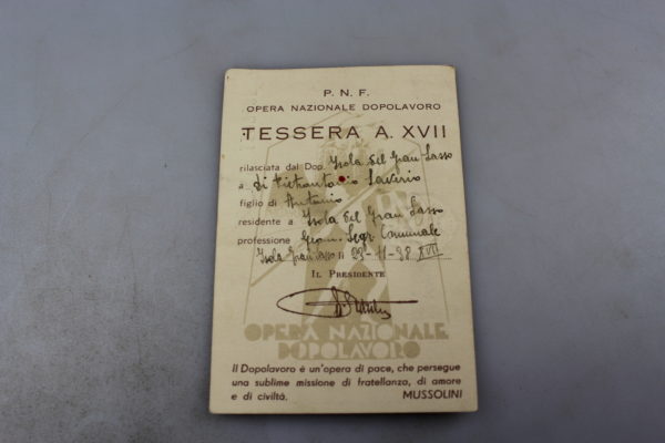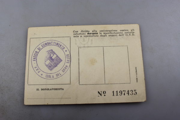 Tessera da iscritto alla Sezione di Isola Gran Sasso del OND, anno XVII° E.F. Buono stato di conservazione.