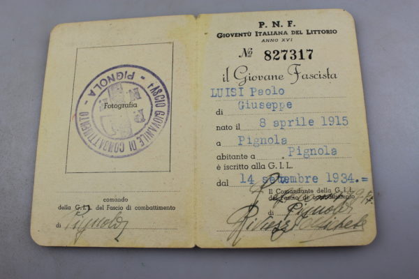 Tessera di un “Giovane Fascista” iscritto alla GIL sezione di Pignola (PZ) XVI° anno E.F.. Buono stato di conservazione
