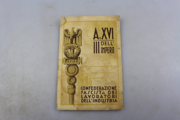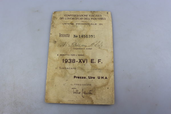 Tessera da iscritto alla Confederazione Fascista dei Lavoratori dell’Industria per l’anno XVI° E.F. Usata in buono stato di conservazione.